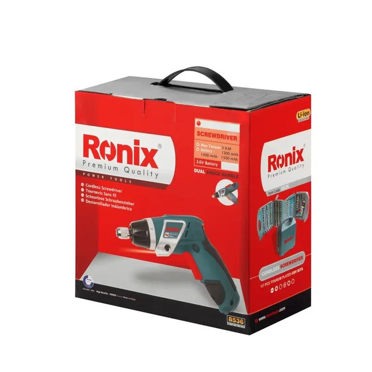 پیچ گوشتی شارژی تاشو 3.6 ولت رونیکس مدل 8536، استفاده از پیچ گوشتی شارژی موجب افزایش چشمگیر سرعت و دقت پیچکاری در کاربریهای صنعتی و خانگی میشود. پیچ گوشتی شارژی 8536 رونیکس، با قابلیت تاشوندگی طراحی شده و میتوان از آن در دو حالت مستقیم و تفنگی استفاده کرد.