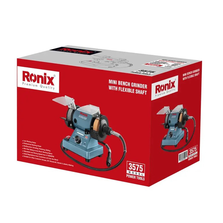 سنگ فرز رومیزی 3575 رونیکس دارای ابعاد کوچک، جمعوجور، کمحجم با یک موتور قدرتمند 120 واتی است. تنظیم سرعت در محدودهی صفر تا 10000 دور بر دقیقه در این ابزار امکانپذیر است. این سنگ فرز، نیازهای مشاغل مختلف مانند صنایع چوب، جواهرسازی، دندانسازی و کارهای فنی خانگی را به خوبی تامین میکند.